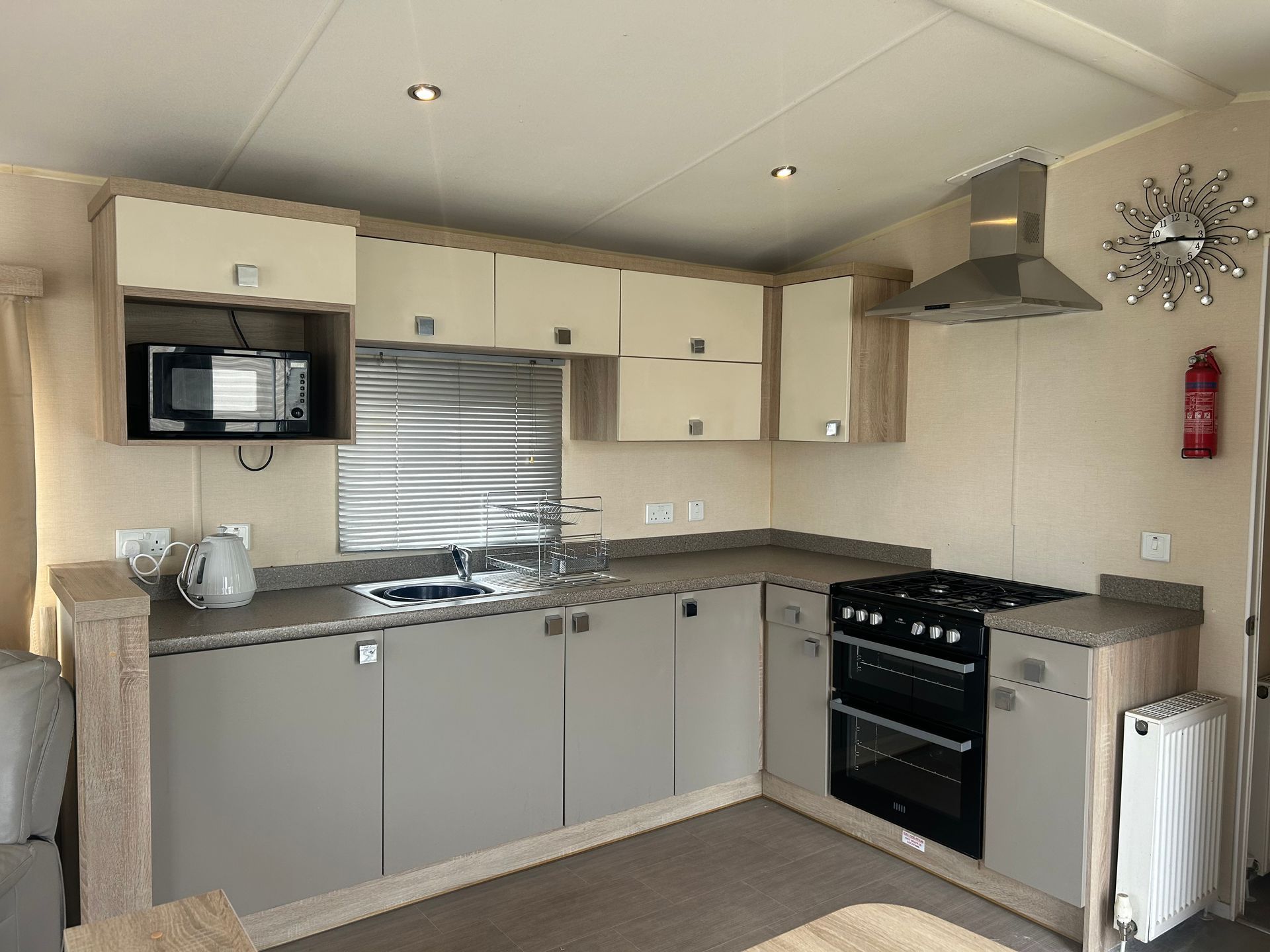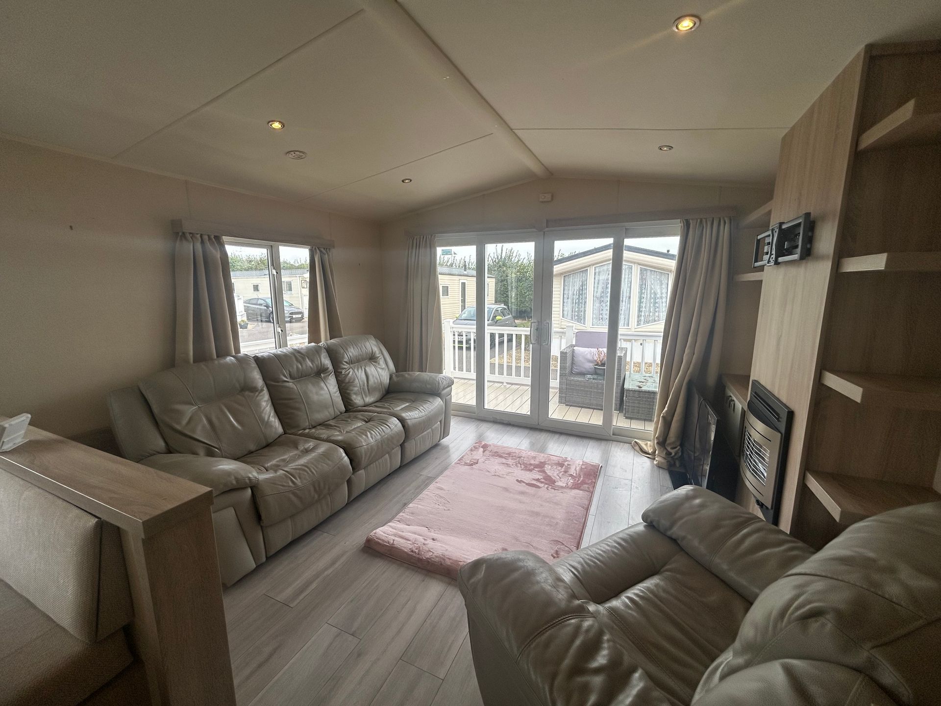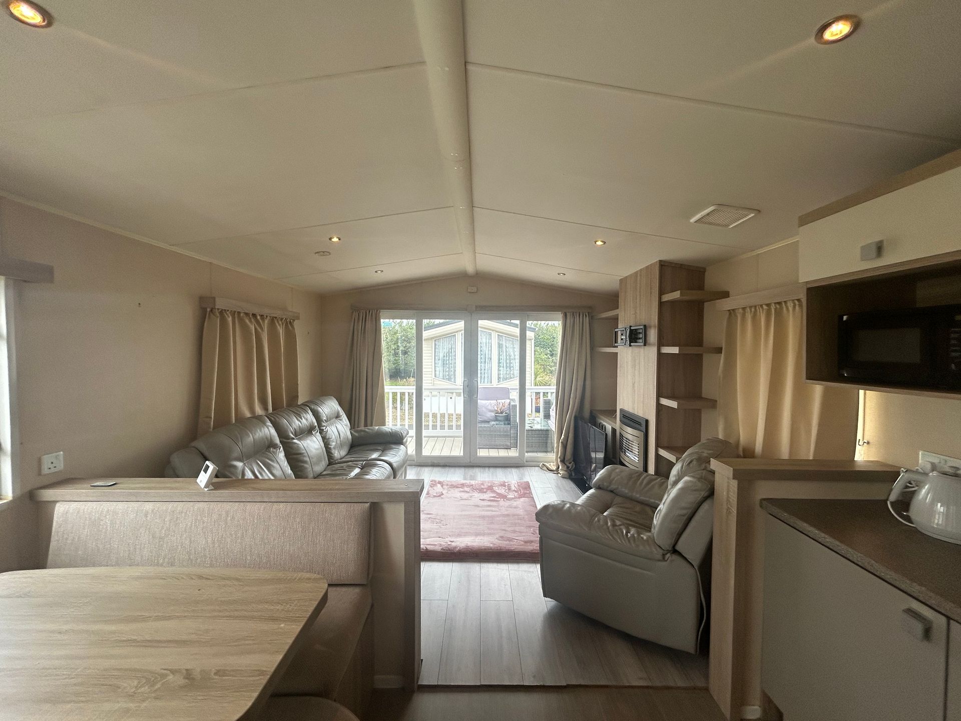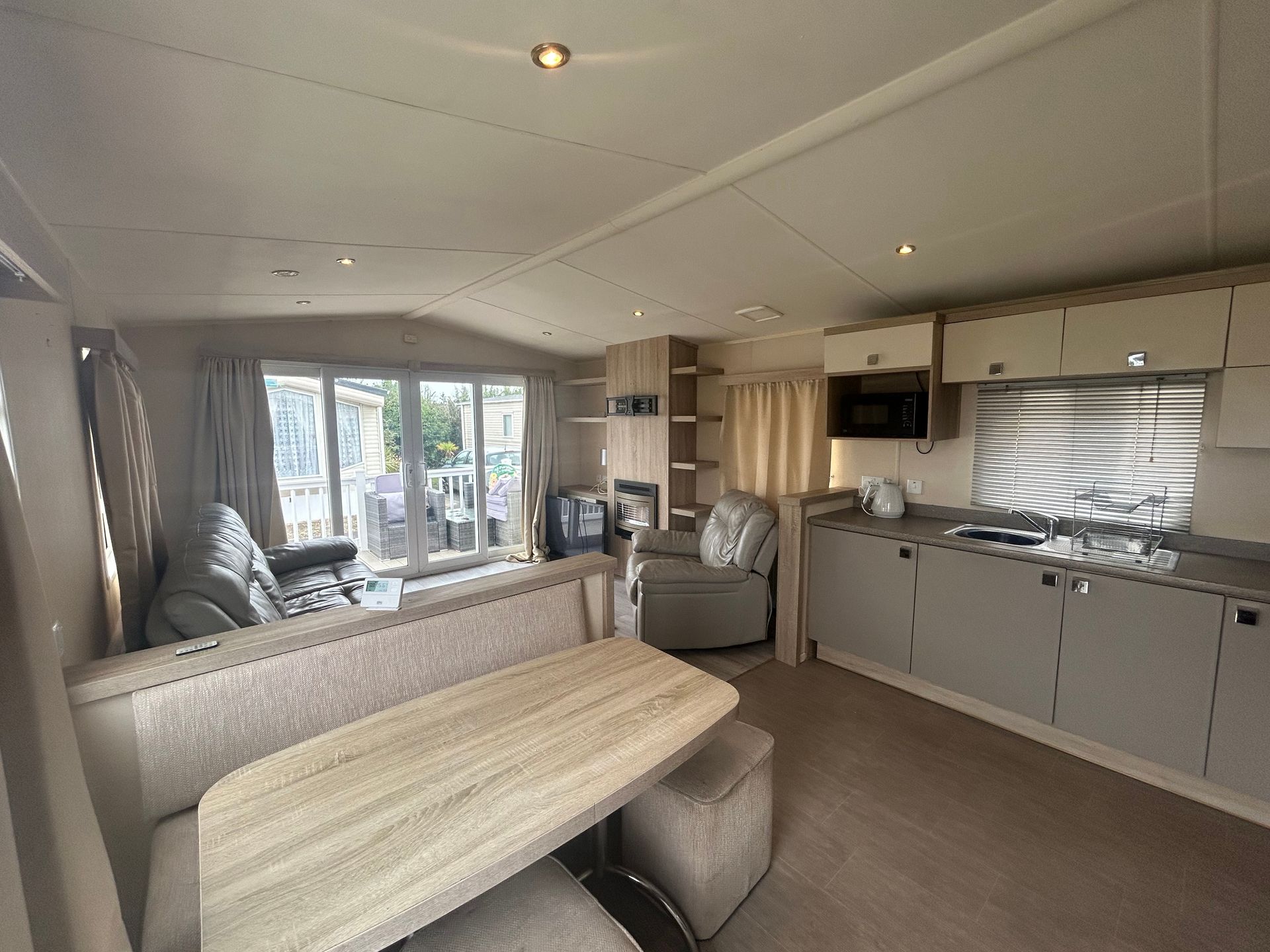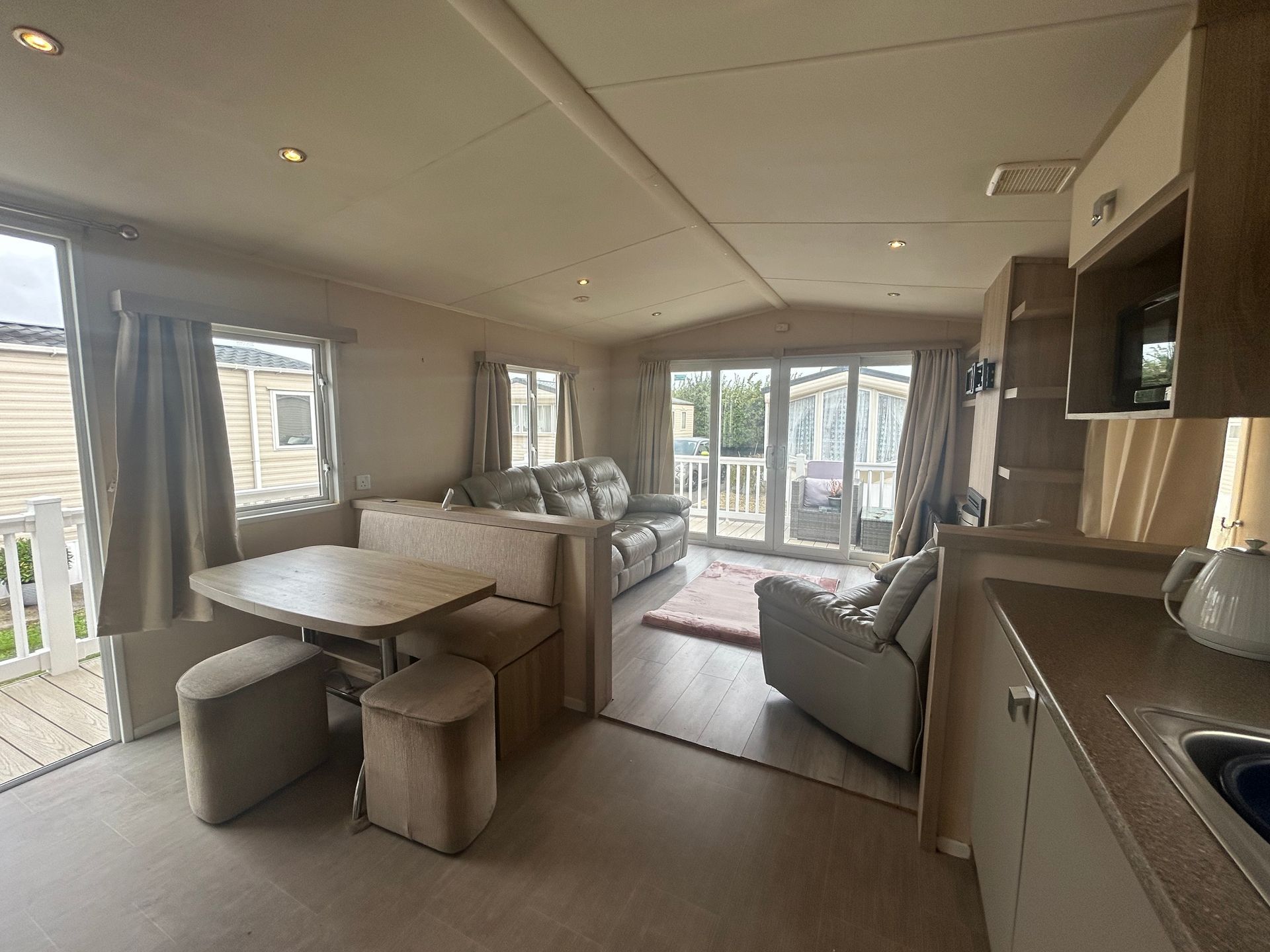 A stylish and practical holiday home, designed for comfort with double glazing and central heating. The open-plan layout is bright and spacious, enhanced by large sliding inline patio doors and windows leading to a wraparound sun-deck.