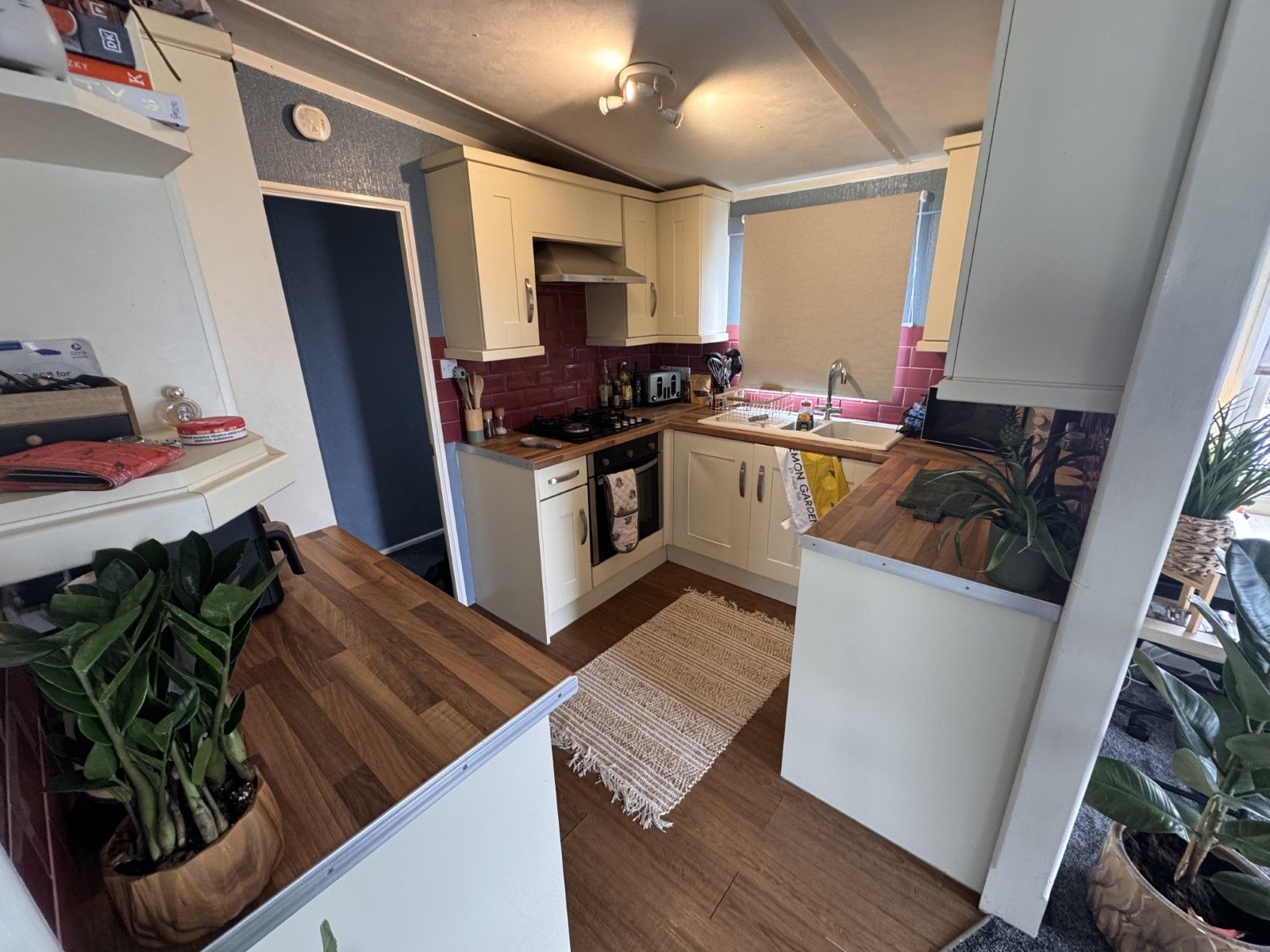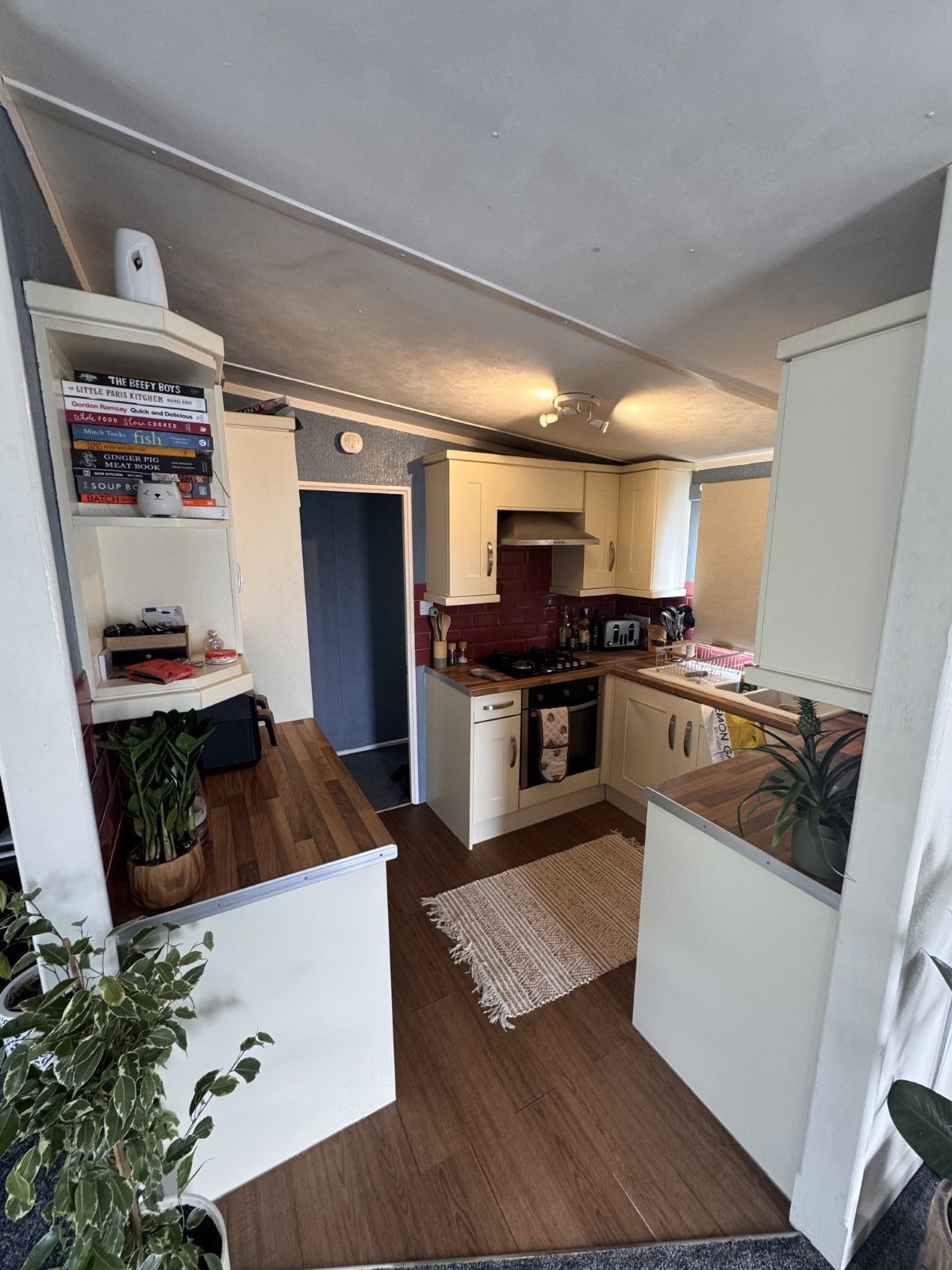 The kitchen is fully equipped with an oven and fridge/freezer.