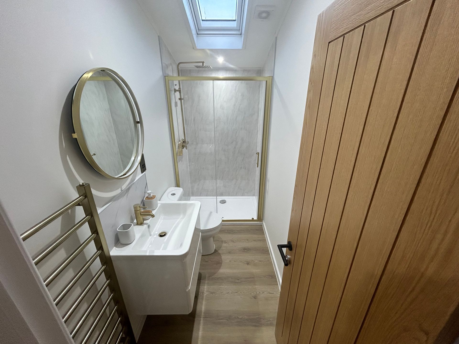Stylish main bathroom with large walk-in shower and feature skylight.