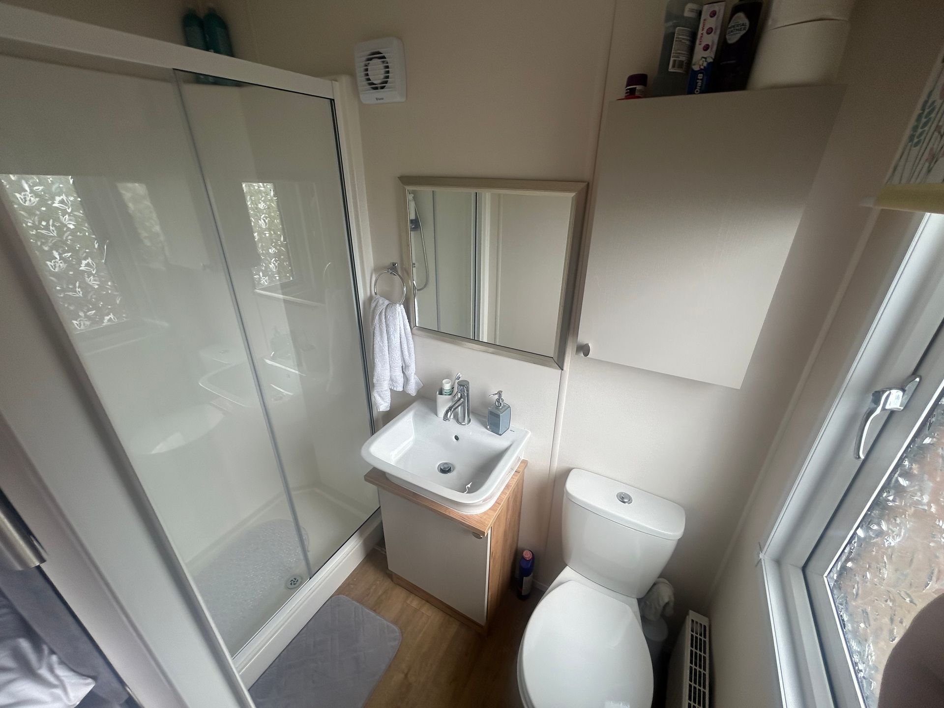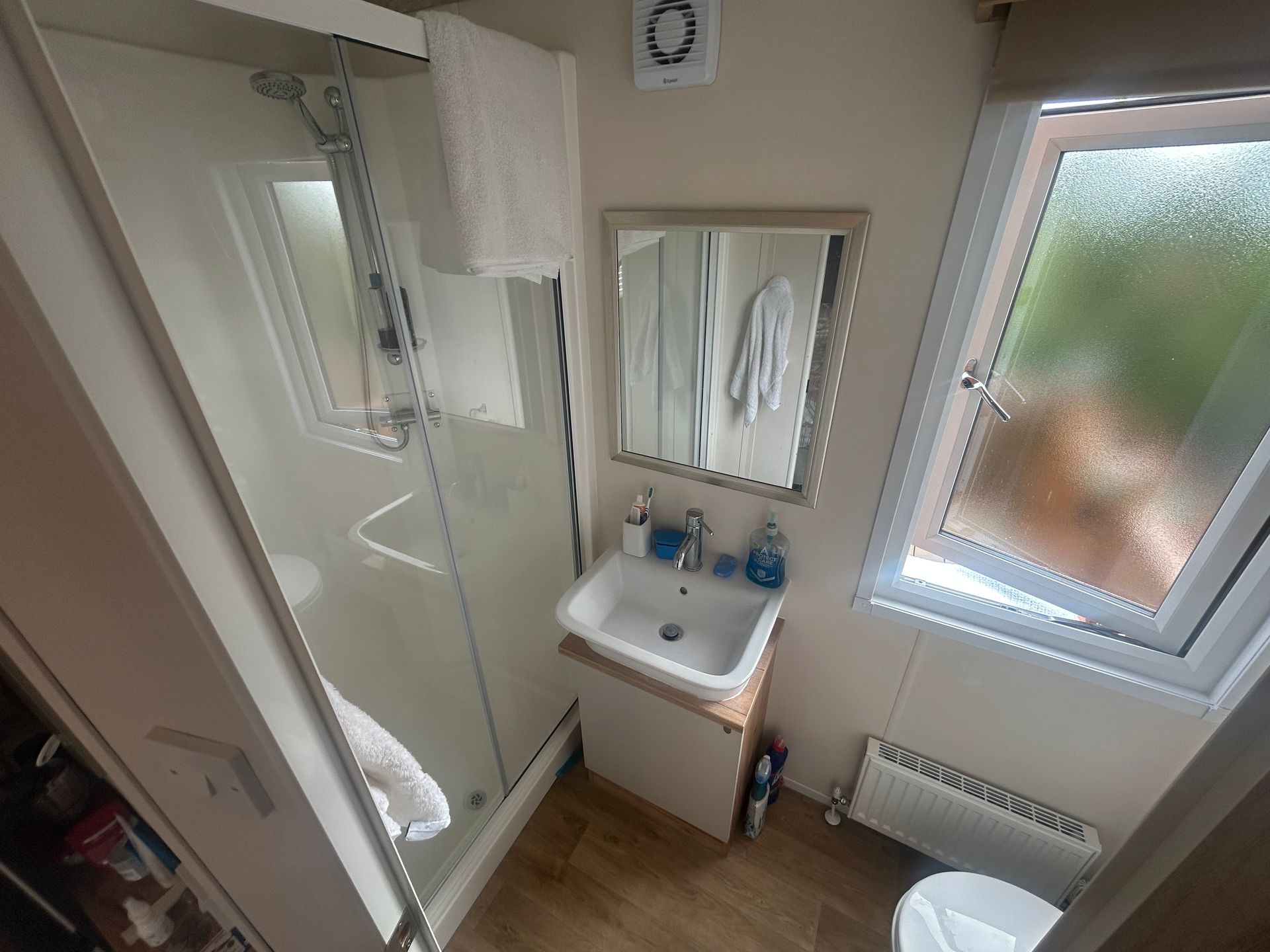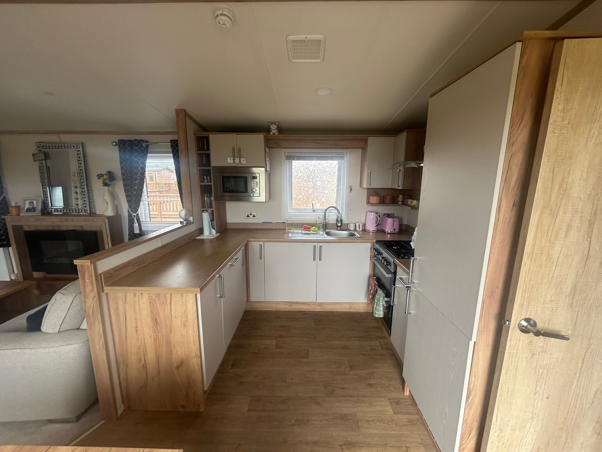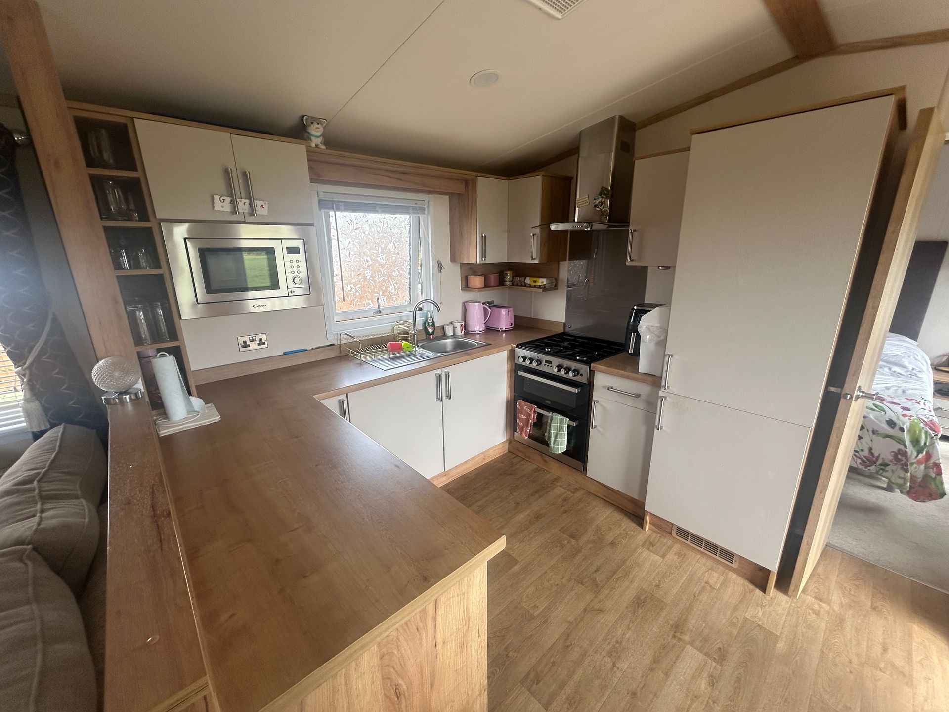 With domestic size kitchen units and integrated appliances including a fridge/freezer, microwave, slimline dishwasher and washing machine, the kitchen has everything you could need.