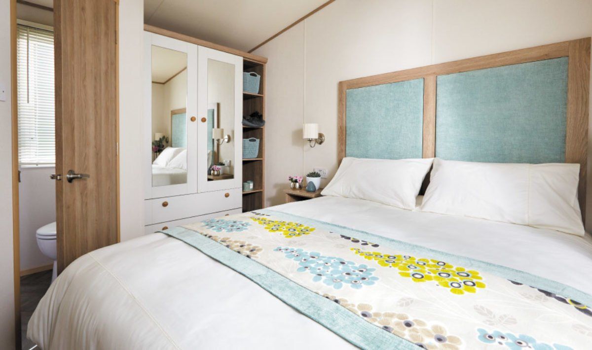 The master bedroom is spacious with a large double (lift-up) bed, 2 bedside cabinets, wall mounted reading lights, a mirrored wardrobe and vanity unit with drawers. There’s also a TV point so you can install a TV if you wish. Another real bonus of the St David is its