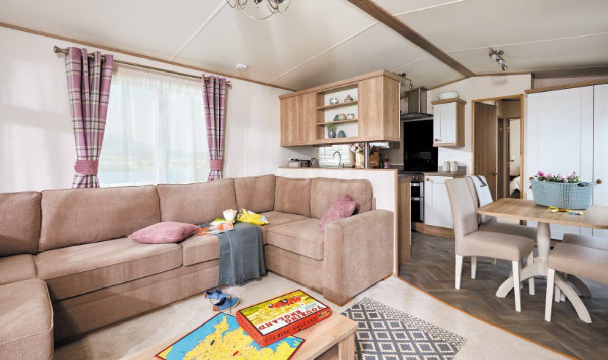 As you enter through the main door you will step straight into the kitchen. The dining table, with four upholstered chairs, is to your left, with the ‘U’ shaped kitchen straight ahead. Tall cupboards housing theintegrated fridge/freezerand boiler are to your right.The kitchen is fully equipped with a four-burner hob, oven and grill, extractor fan and fitted microwave. The cream and timber kitchen units feature soft-close hinges and the 40mm worktops convey a real sense of quality. The whole kitchen is enhanced by stylish under-cabinet spotlights.