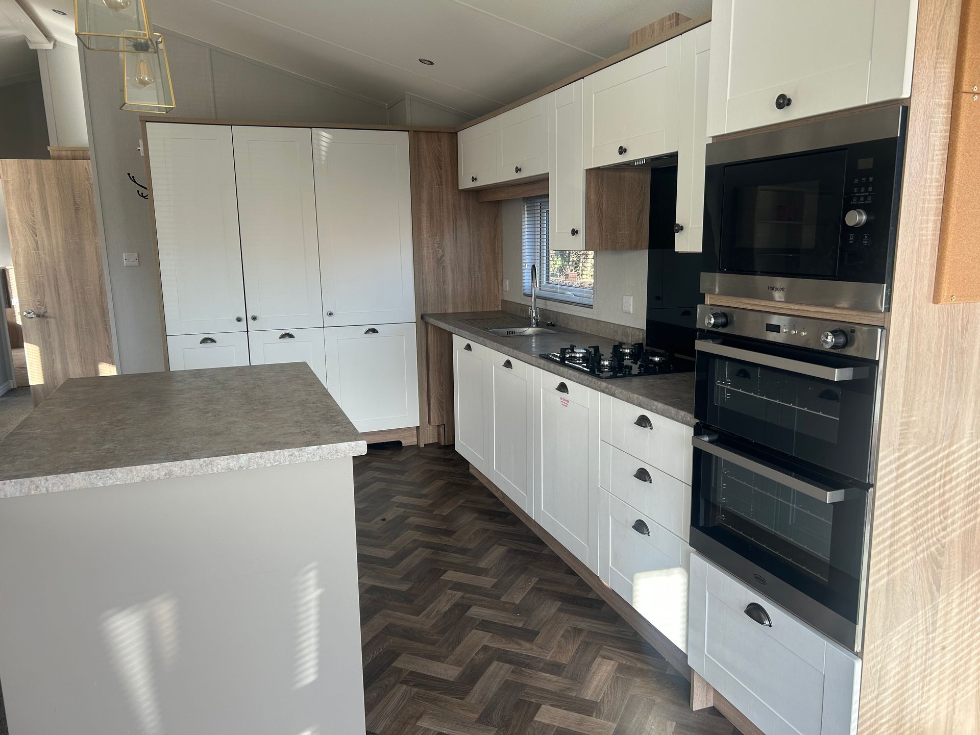 The large kitchen comes complete with an island unit and double width larder, plus stylish integrated appliances.