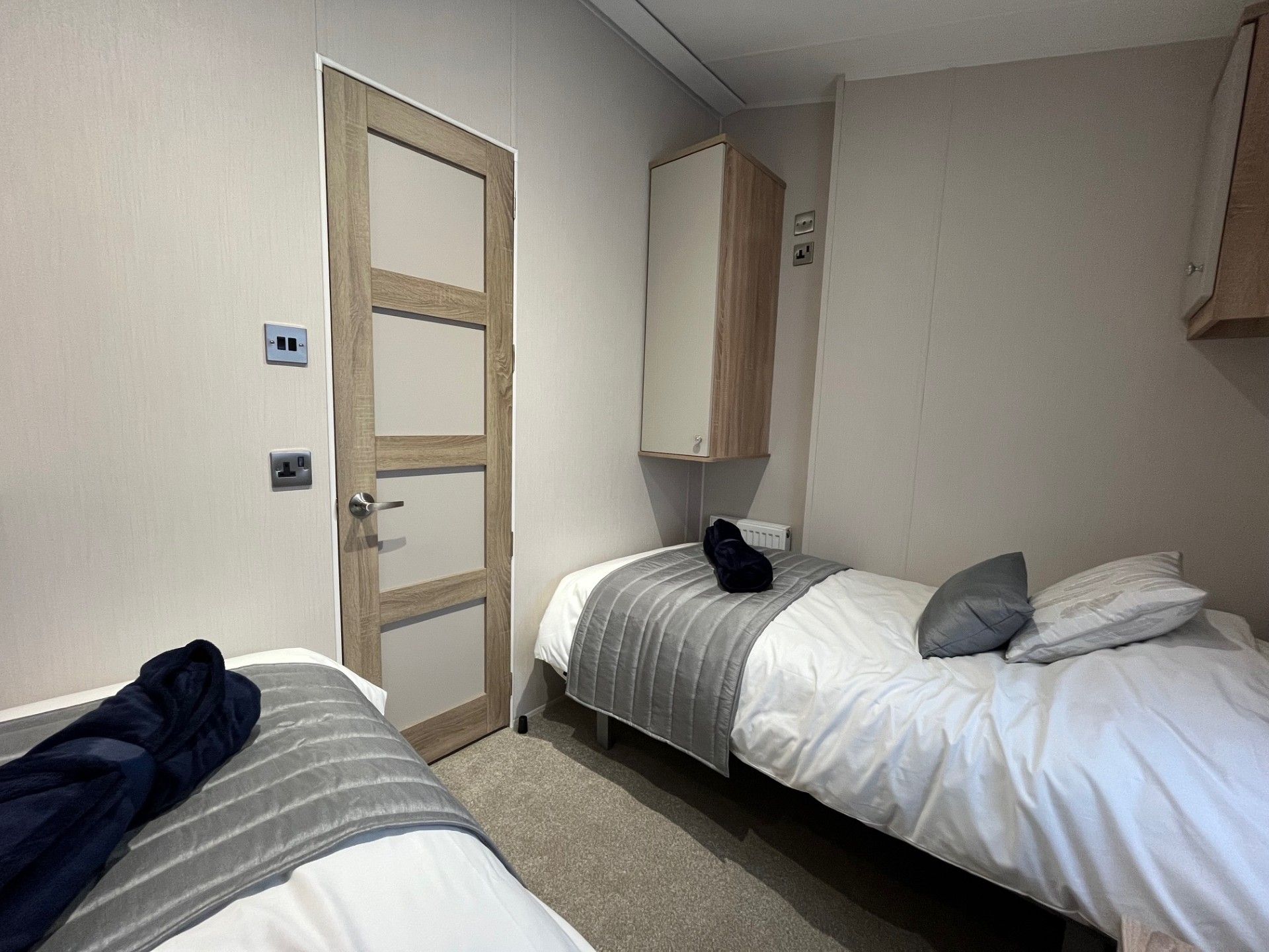 The main bedroom boasts a huge king-size bed, en-suite bathroom and walk-in wardrobe, and the second bedroom is perfect for overnight guests, with comfy twin beds and plenty of storage space.