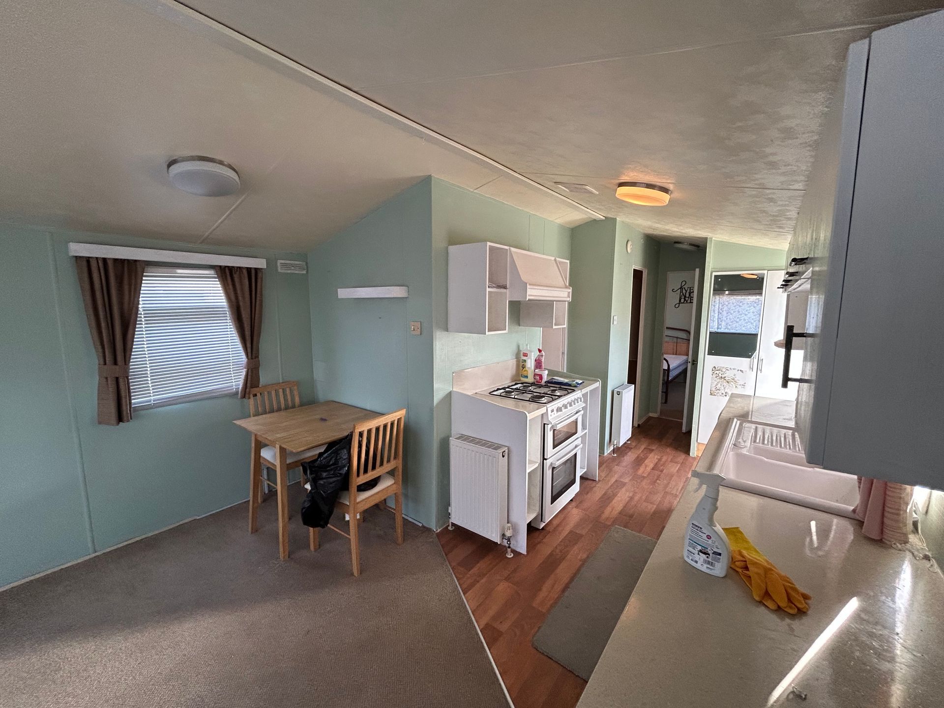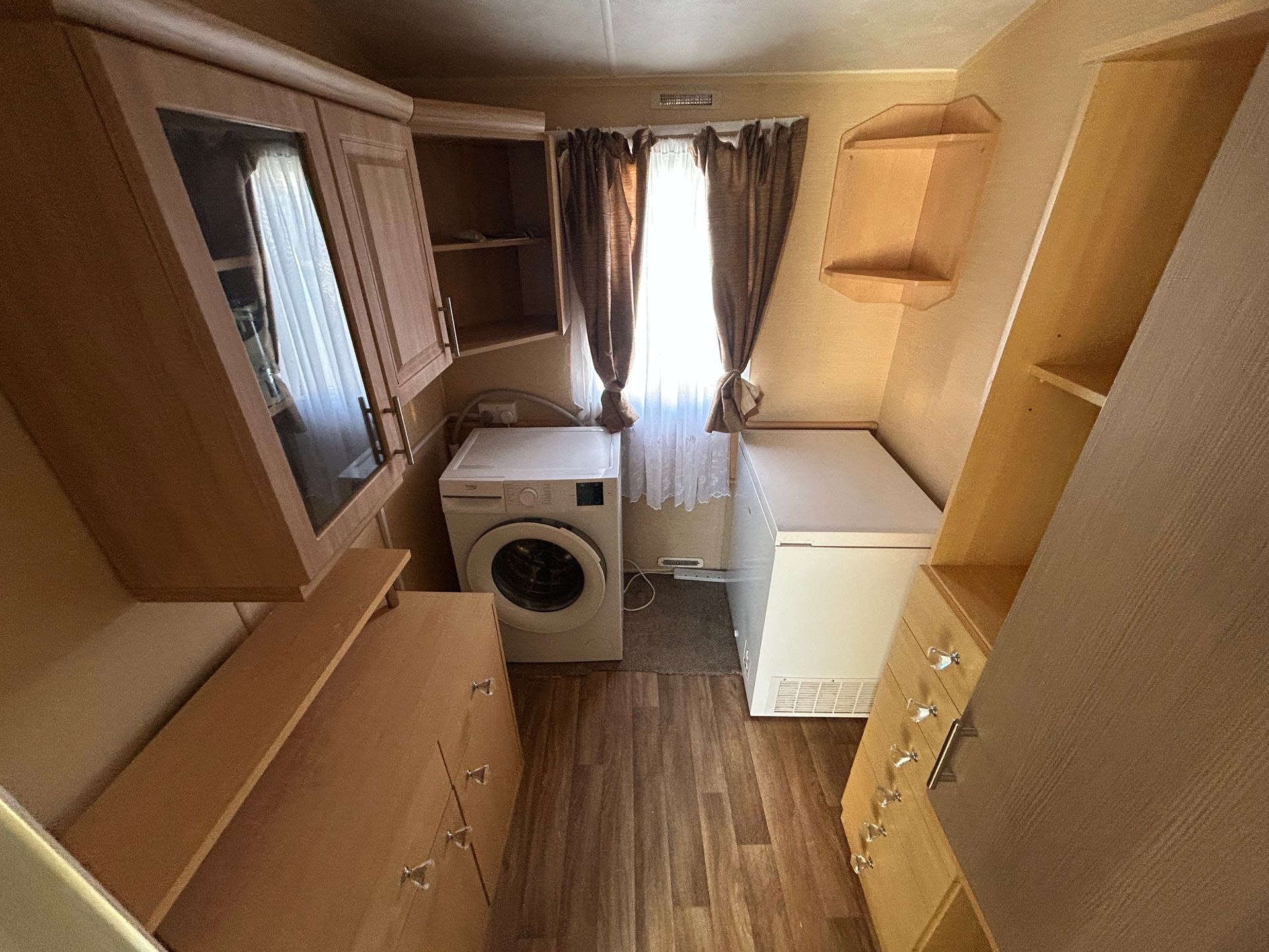 Fully equipped kitchen with an under-counter fridge, plus oven and hob with extractor fan. The second bedroom is currently used as a utility room with washing machine and chest freezer, but would be easy to convert back.