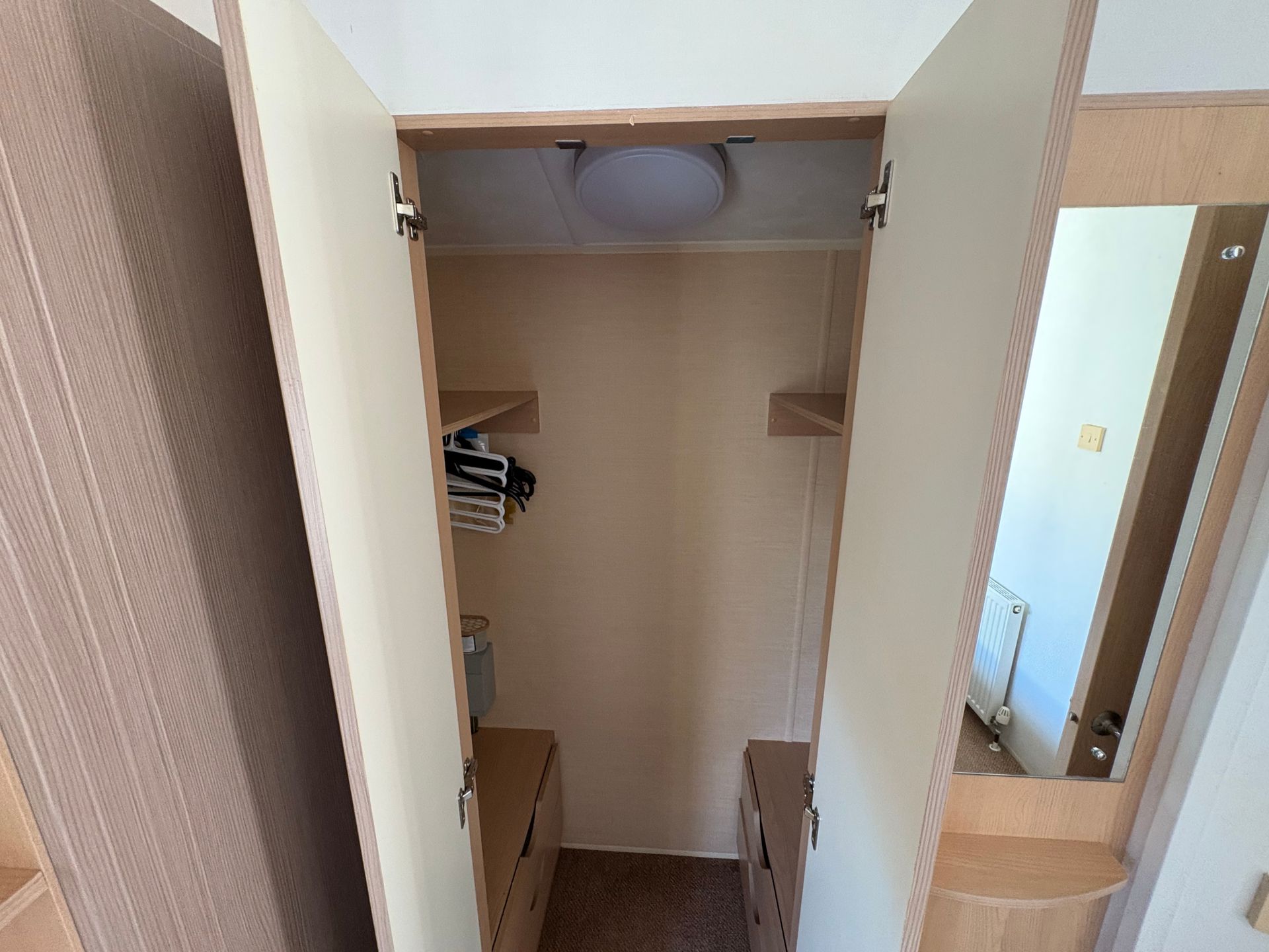 There are two bedrooms, including a generous master with overhead storage, a vanity area with mirror and walk-in wardrobe - plus twin room with fitted furniture.